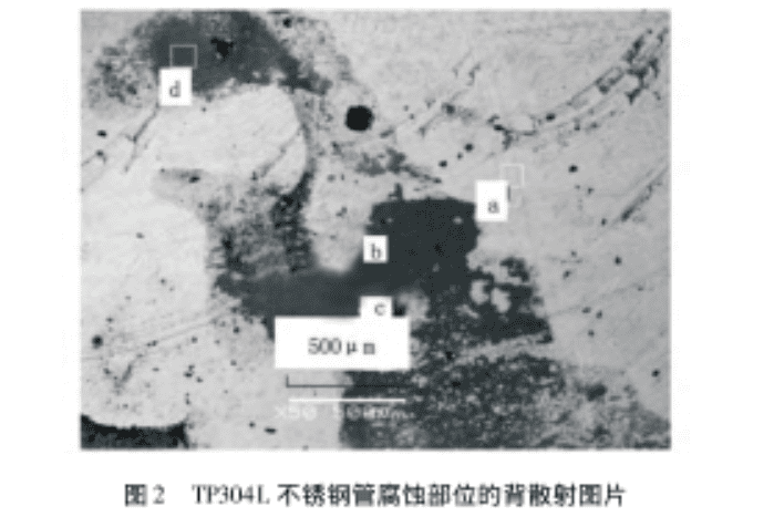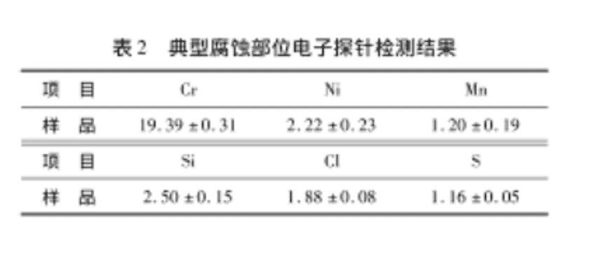 利用电子探针对TP304L不锈钢管完好部位与穿孔部位进行成分检测,具体检测部位如图2所示,典型腐蚀部位电子探讨检测结果如表2所示。试样直接从失效钢管上用钢锯截取,表面未清洗处理,以保证腐蚀产物的完整。图2中a